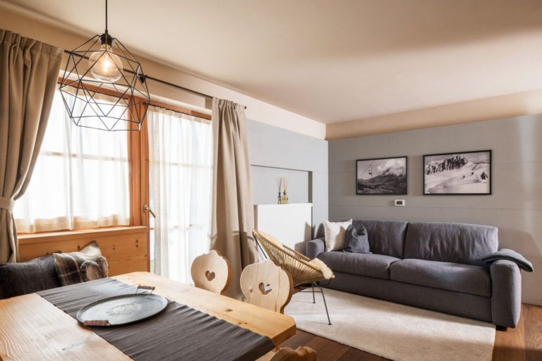 Completely cladded in wood, it features a large living room with kitchen and comfortable sofa bed, a double bedroom, a bedroom with two single beds, a bathroom with bathtub and second bathroom.