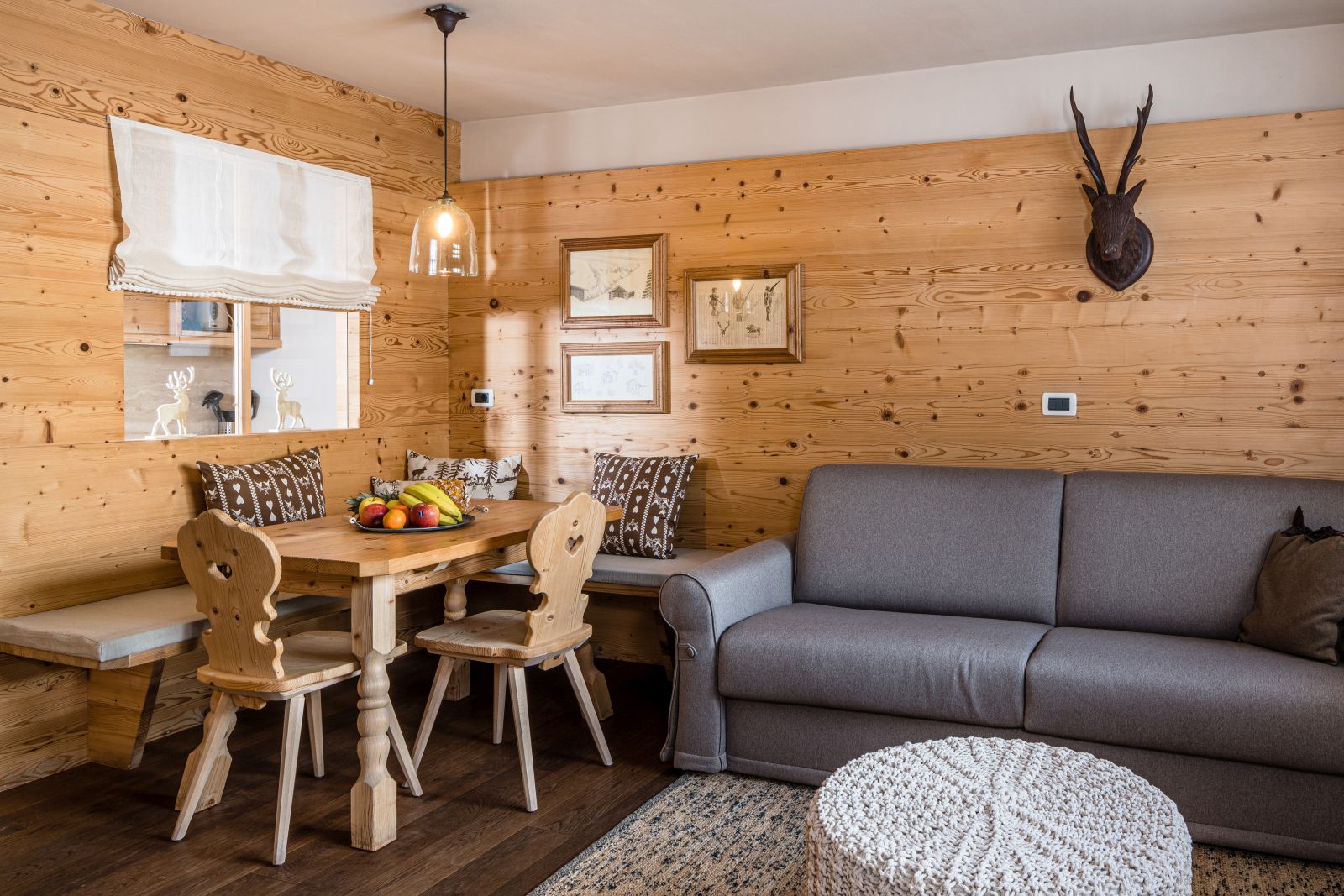 Completely cladded in wood, it features a large living room with kitchen and comfortable sofa bed, a double bedroom, a bedroom with two single beds, a bathroom with bathtub and second bathroom.